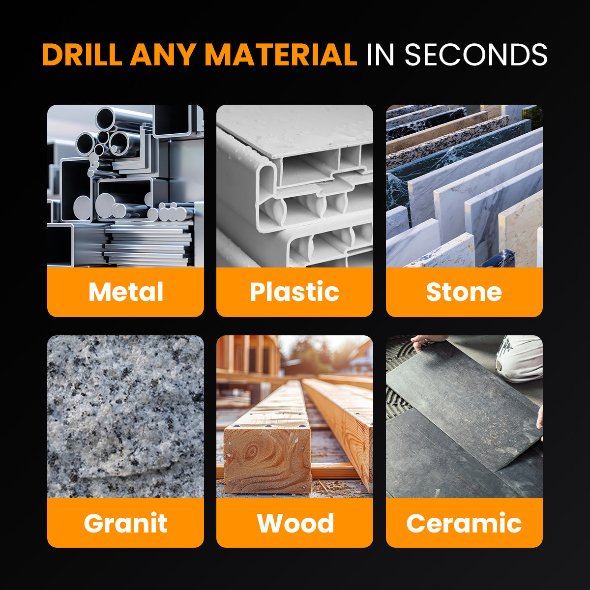 These bits are perfect for drilling through various materials such as metal, wood, granite, stone, tile, and glass. They provide fast, precise drilling with no chipping.